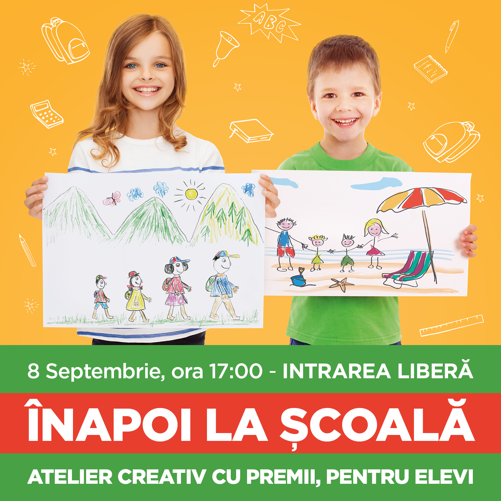 Vino duminica, 8 septembrie, la ora 17:00, cu desenul tau de vacanta, iar noi te recompensam cu rechizite. Participa la atelierul Scoala mea, si poti castiga ghiozdanelul norocos pentru noul an scolar! Participarea este gratuita. #backtoschool #inapoi la scoala #11anidefocsanimall
